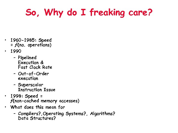 So, Why do I freaking care? • 1960 -1985: Speed = ƒ(no. operations) • 1990 – Pipelined Execution & Fast Clock Rate – Out-of-Order execution – Superscalar Instruction Issue • 1998: Speed = ƒ(non-cached memory accesses) • What does this mean for – Compilers? , Operating Systems? , Algorithms? Data Structures?