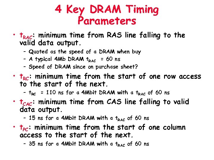4 Key DRAM Timing Parameters • t. RAC: minimum time from RAS line falling to the valid data output. – Quoted as the speed of a DRAM when buy – A typical 4 Mb DRAM t. RAC = 60 ns – Speed of DRAM since on purchase sheet? • t. RC: minimum time from the start of one row access to the start of the next. – t. RC = 110 ns for a 4 Mbit DRAM with a t. RAC of 60 ns • t. CAC: minimum time from CAS line falling to valid data output. – 15 ns for a 4 Mbit DRAM with a t. RAC of 60 ns • t. PC: minimum time from the start of one column access to the start of the next. – 35 ns for a 4 Mbit DRAM with a t. RAC of 60 ns
