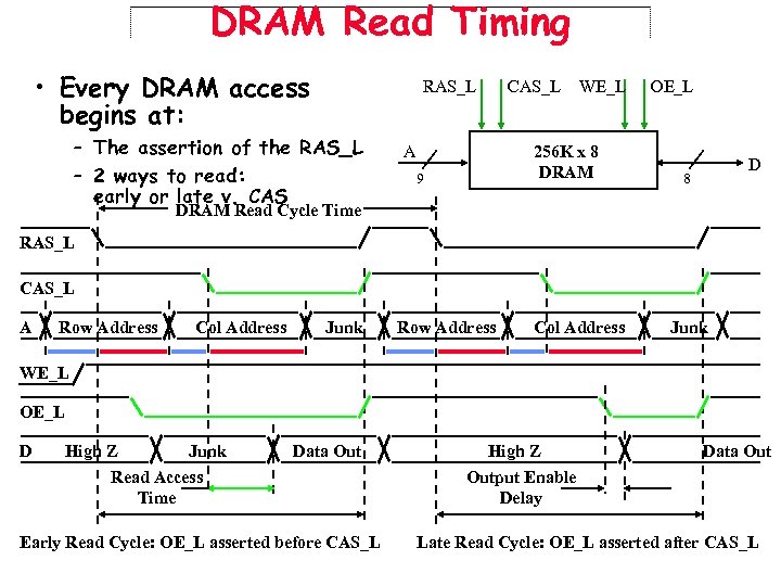 DRAM Read Timing • Every DRAM access begins at: RAS_L – The assertion of the RAS_L – 2 ways to read: early or late v. CAS A CAS_L WE_L 256 K x 8 DRAM 9 OE_L D 8 DRAM Read Cycle Time RAS_L CAS_L A Row Address Col Address Junk WE_L OE_L D High Z Junk Read Access Time Data Out Early Read Cycle: OE_L asserted before CAS_L High Z Output Enable Delay Data Out Late Read Cycle: OE_L asserted after CAS_L