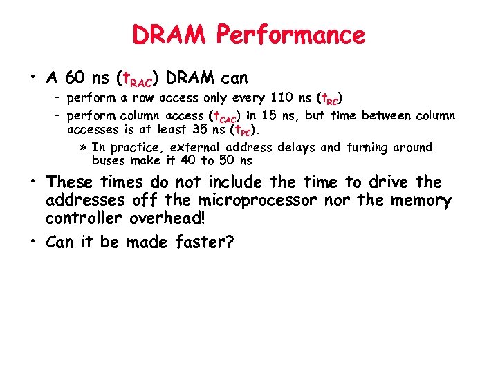 DRAM Performance • A 60 ns (t. RAC) DRAM can – perform a row access only every 110 ns (t. RC) – perform column access (t. CAC) in 15 ns, but time between column accesses is at least 35 ns (t. PC). » In practice, external address delays and turning around buses make it 40 to 50 ns • These times do not include the time to drive the addresses off the microprocessor nor the memory controller overhead! • Can it be made faster?