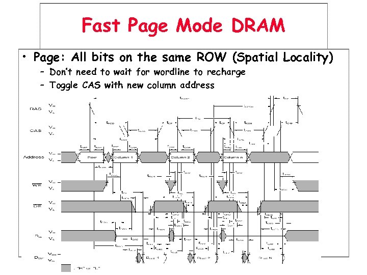 Fast Page Mode DRAM • Page: All bits on the same ROW (Spatial Locality) – Don’t need to wait for wordline to recharge – Toggle CAS with new column address