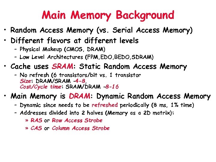 Main Memory Background • Random Access Memory (vs. Serial Access Memory) • Different flavors at different levels – Physical Makeup (CMOS, DRAM) – Low Level Architectures (FPM, EDO, BEDO, SDRAM) • Cache uses SRAM: Static Random Access Memory – No refresh (6 transistors/bit vs. 1 transistor Size: DRAM/SRAM 4 -8, Cost/Cycle time: SRAM/DRAM 8 -16 • Main Memory is DRAM: Dynamic Random Access Memory – Dynamic since needs to be refreshed periodically (8 ms, 1% time) – Addresses divided into 2 halves (Memory as a 2 D matrix): » RAS or Row Access Strobe » CAS or Column Access Strobe