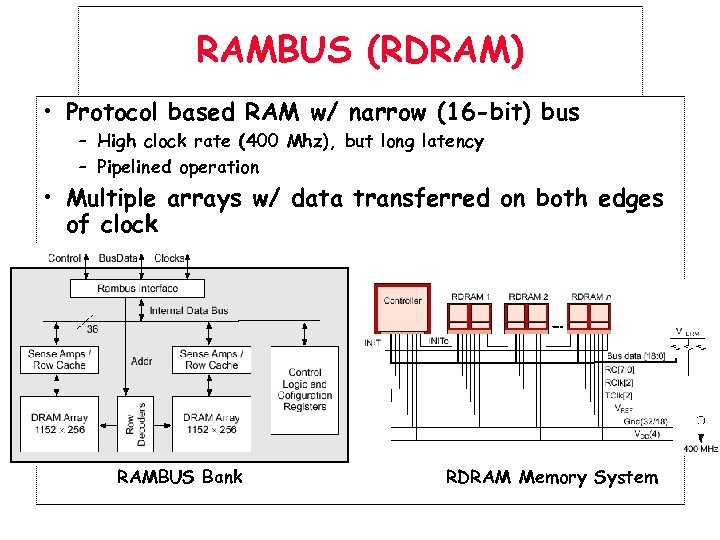 RAMBUS (RDRAM) • Protocol based RAM w/ narrow (16 -bit) bus – High clock rate (400 Mhz), but long latency – Pipelined operation • Multiple arrays w/ data transferred on both edges of clock RAMBUS Bank RDRAM Memory System