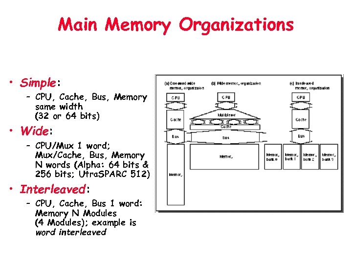 Main Memory Organizations • Simple: – CPU, Cache, Bus, Memory same width (32 or 64 bits) • Wide: – CPU/Mux 1 word; Mux/Cache, Bus, Memory N words (Alpha: 64 bits & 256 bits; Utra. SPARC 512) • Interleaved: – CPU, Cache, Bus 1 word: Memory N Modules (4 Modules); example is word interleaved