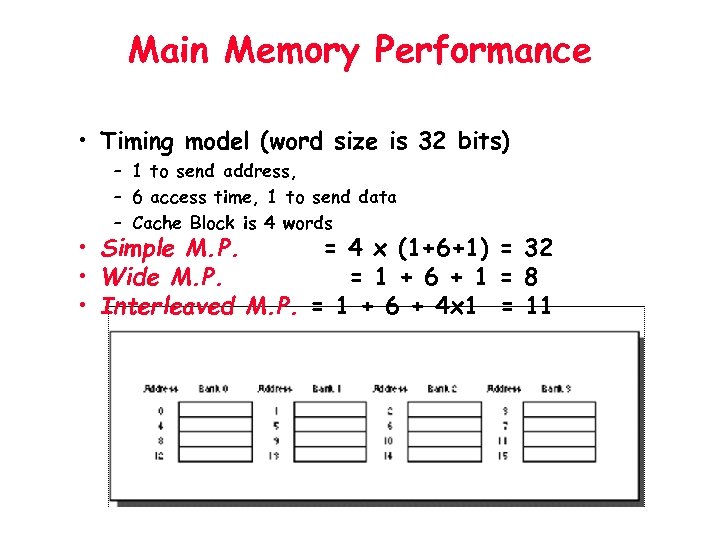 Main Memory Performance • Timing model (word size is 32 bits) – 1 to send address, – 6 access time, 1 to send data – Cache Block is 4 words • Simple M. P. = 4 x (1+6+1) = 32 • Wide M. P. = 1 + 6 + 1 = 8 • Interleaved M. P. = 1 + 6 + 4 x 1 = 11