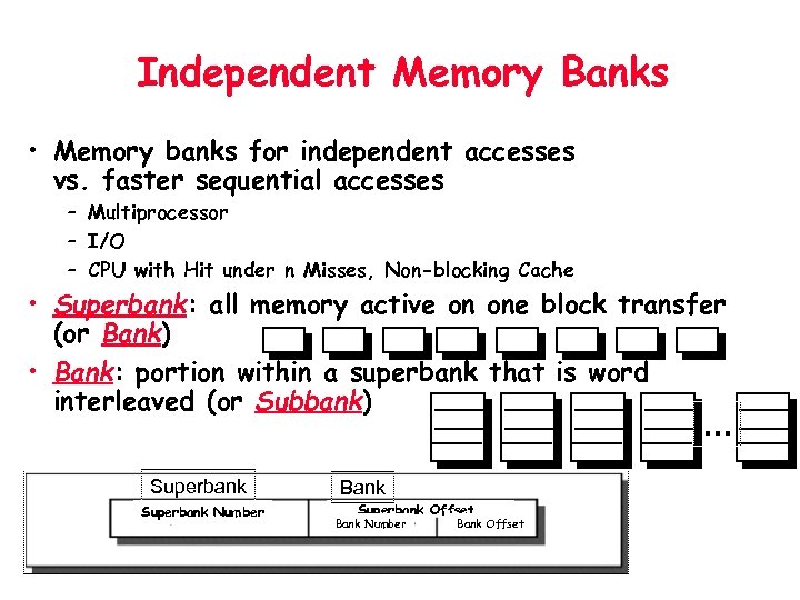 Independent Memory Banks • Memory banks for independent accesses vs. faster sequential accesses – Multiprocessor – I/O – CPU with Hit under n Misses, Non-blocking Cache • Superbank: all memory active on one block transfer (or Bank) • Bank: portion within a superbank that is word interleaved (or Subbank) … Superbank Number Bank Superbank Offset Bank Number Bank Offset