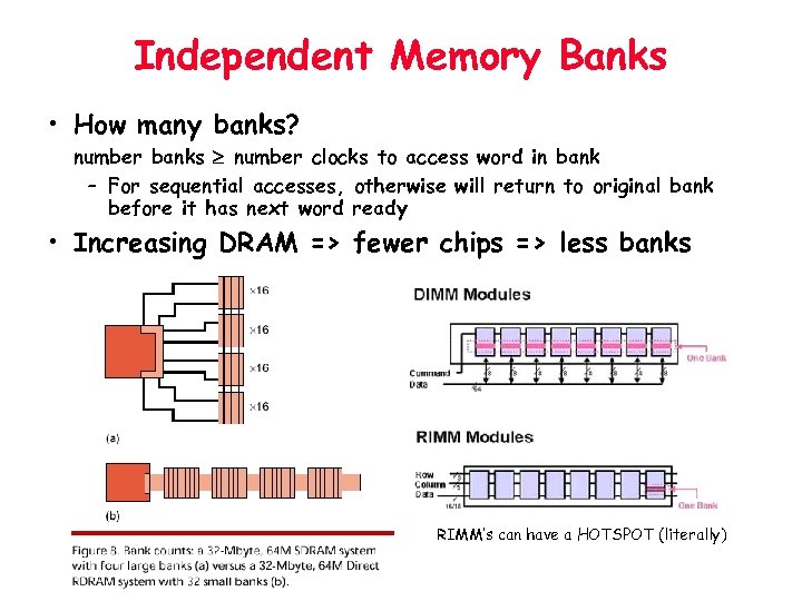 Independent Memory Banks • How many banks? number banks number clocks to access word in bank – For sequential accesses, otherwise will return to original bank before it has next word ready • Increasing DRAM => fewer chips => less banks RIMM’s can have a HOTSPOT (literally)