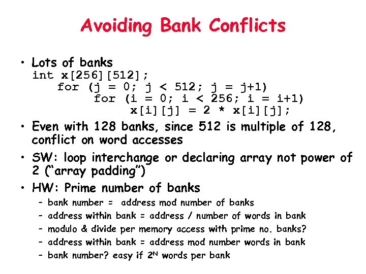 Avoiding Bank Conflicts • Lots of banks int x[256][512]; for (j = 0; j < 512; j = j+1) for (i = 0; i < 256; i = i+1) x[i][j] = 2 * x[i][j]; • Even with 128 banks, since 512 is multiple of 128, conflict on word accesses • SW: loop interchange or declaring array not power of 2 (“array padding”) • HW: Prime number of banks – – – bank number = address mod number of banks address within bank = address / number of words in bank modulo & divide per memory access with prime no. banks? address within bank = address mod number words in bank number? easy if 2 N words per bank