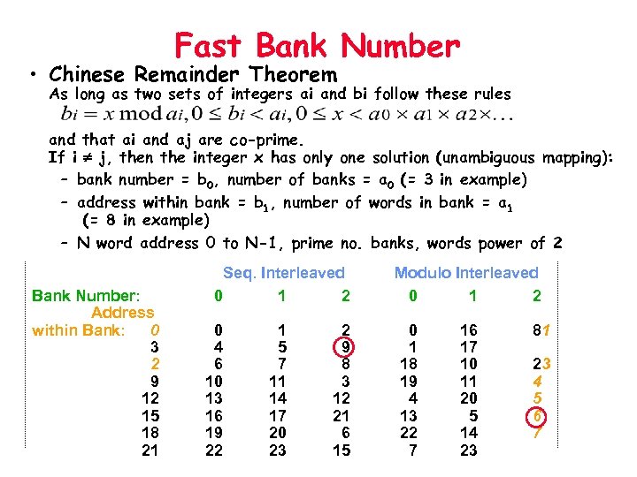 Fast Bank Number • Chinese Remainder Theorem As long as two sets of integers ai and bi follow these rules and that ai and aj are co-prime. If i j, then the integer x has only one solution (unambiguous mapping): – bank number = b 0, number of banks = a 0 (= 3 in example) – address within bank = b 1, number of words in bank = a 1 (= 8 in example) – N word address 0 to N-1, prime no. banks, words power of 2 Bank Number: Address within Bank: 0 3 2 9 12 15 18 21 Seq. Interleaved 0 1 2 0 4 6 10 13 16 19 22 1 5 7 11 14 17 20 23 2 9 8 3 12 21 6 15 Modulo Interleaved 0 1 2 0 1 18 19 4 13 22 7 16 17 10 11 20 5 14 23 81 23 4 5 6 7