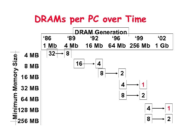 Minimum Memory Size DRAMs per PC over Time ‘ 86 1 Mb 32 4 MB 8 MB 16 MB 32 MB 64 MB DRAM Generation ‘ 89 ‘ 92 ‘ 96 ‘ 99 ‘ 02 4 Mb 16 Mb 64 Mb 256 Mb 1 Gb 8 16 4 8 2 4 1 8 2 128 MB 4 1 256 MB 8 2