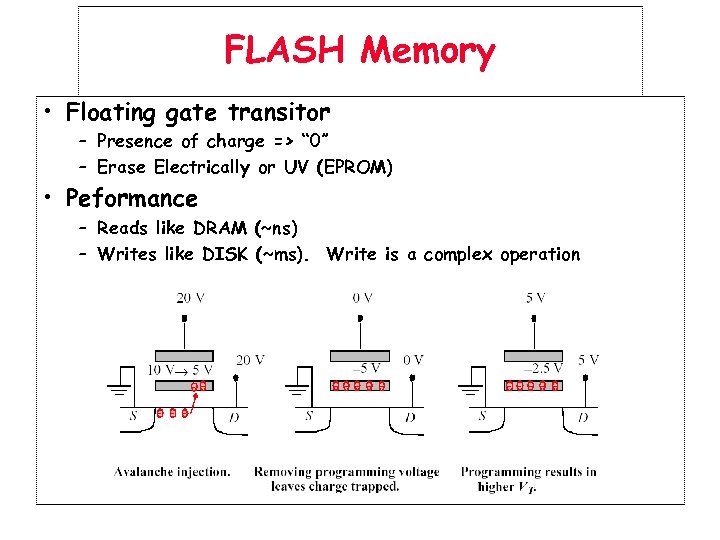 FLASH Memory • Floating gate transitor – Presence of charge => “ 0” – Erase Electrically or UV (EPROM) • Peformance – Reads like DRAM (~ns) – Writes like DISK (~ms). Write is a complex operation