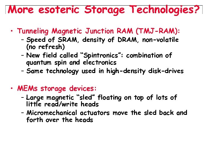 More esoteric Storage Technologies? • Tunneling Magnetic Junction RAM (TMJ-RAM): – Speed of SRAM, density of DRAM, non-volatile (no refresh) – New field called “Spintronics”: combination of quantum spin and electronics – Same technology used in high-density disk-drives • MEMs storage devices: – Large magnetic “sled” floating on top of lots of little read/write heads – Micromechanical actuators move the sled back and forth over the heads
