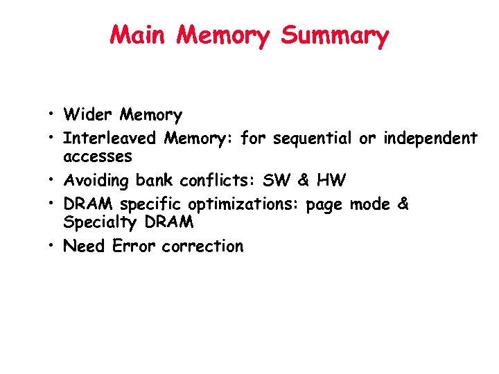 Main Memory Summary • Wider Memory • Interleaved Memory: for sequential or independent accesses • Avoiding bank conflicts: SW & HW • DRAM specific optimizations: page mode & Specialty DRAM • Need Error correction