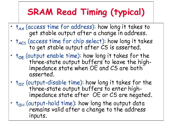 SRAM Read Timing (typical) • t. AA (access time for address): how long it takes to get stable output after a change in address. • t. ACS (access time for chip select): how long it takes to get stable output after CS is asserted. • t. OE (output enable time): how long it takes for the three-state output buffers to leave the highimpedance state when OE and CS are both asserted. • t. OZ (output-disable time): how long it takes for the three-state output buffers to enter highimpedance state after OE or CS are negated. • t. OH (output-hold time): how long the output data remains valid after a change to the address inputs.