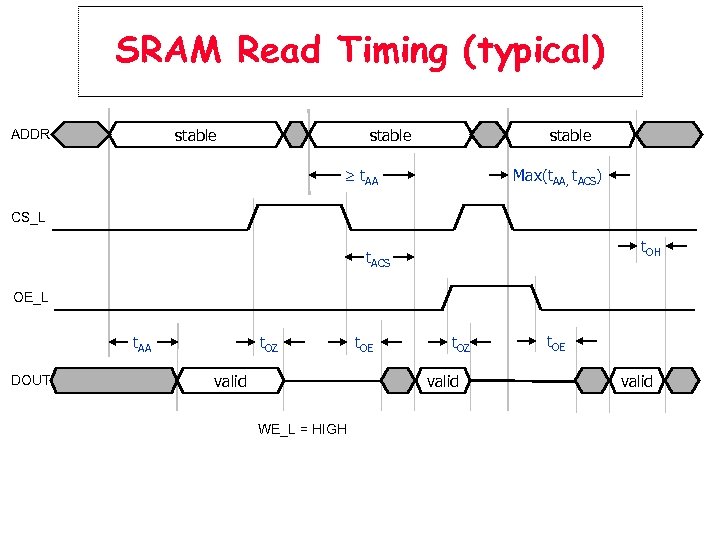 SRAM Read Timing (typical) stable ADDR stable t. AA Max(t. AA, t. ACS) CS_L t. OH t. ACS OE_L t. AA DOUT t. OZ t. OE t. OZ valid WE_L = HIGH t. OE valid
