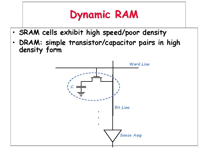 Dynamic RAM • SRAM cells exhibit high speed/poor density • DRAM: simple transistor/capacitor pairs in high density form Word Line C . . . Bit Line Sense Amp