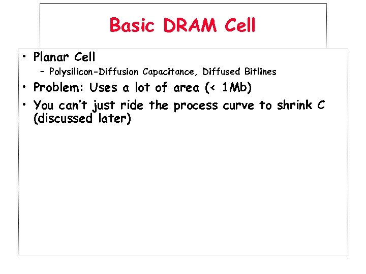 Basic DRAM Cell • Planar Cell – Polysilicon-Diffusion Capacitance, Diffused Bitlines • Problem: Uses a lot of area (< 1 Mb) • You can’t just ride the process curve to shrink C (discussed later)