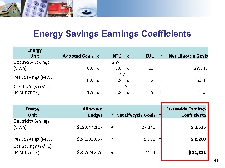 Energy Savings Earnings Coefficients Energy Unit Electricity Savings (GWh) Peak Savings (MW) Gas Savings (w/ IE) (MMtherms) Adopted Goals x 8. 0 x 6. 0 x 1. 9 x Allocated Budget NTG x 2, 84 0. 8 x 57 0. 8 x 9 0. 8 x EUL = Net Lifecycle Goals 12 = 27, 340 12 = 5, 530 15 = 1103 ÷ Net Lifecycle Goals = Statewide Earnings Coefficients $69, 047, 117 ÷ 27, 340 = $ 2, 525 $34, 282, 037 ÷ 5, 530 = $ 6, 200 $23, 524, 076 ÷ 1103 = $ 21, 331 48