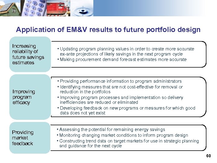 Application of EM&V results to future portfolio design Increasing reliability of future savings estimates • Updating program planning values in order to create more accurate ex-ante projections of likely savings in the next program cycle • Making procurement demand forecast estimates more accurate Improving program efficacy • Providing performance information to program administrators • Identifying measures that are not cost-effective for removal or reduction in the portfolios • Improving program processes and implementation so delivery inefficiencies are reduced or eliminated • Developing feedback on new programs or measures for which good data does not yet exist Providing market feedback • Assessing the potential for remaining energy savings • Monitoring changing market conditions to inform program design • Constructing trend data on target markets for use in strategic planning and guidance for the next cycle 60 60