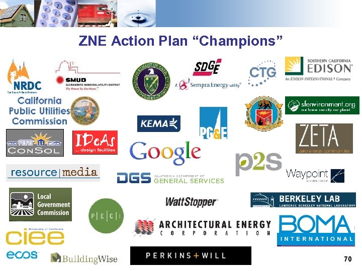 Action Plan Example • • • Strategy 1 -3: Establish “Path to Zero” Campaign to Create Demand for High. Efficiency Buildings 1 -3 -2 Organize forums to develop and exchange experience and data on emerging technologies, practices, and designs that deliver ultra-low and ZNE buildings Champions: Peter Turnbull (PG&E), Gregg Ander (SCE), RK Stewart (Perkins & Will) Complete -Convene regular forums involving key market actors, technical experts Q 3 2010 -Record and inventory data and related emerging tech at forums, and publish on-line -Survey forum participants re: best information for owners, architects Q 4 2010 -Coordinate forums with “Lead By Example” efforts (Strategy 2 -1) -Identify and craft ZNE best practices and technical guides; create a ZNE Mentorship program - 69