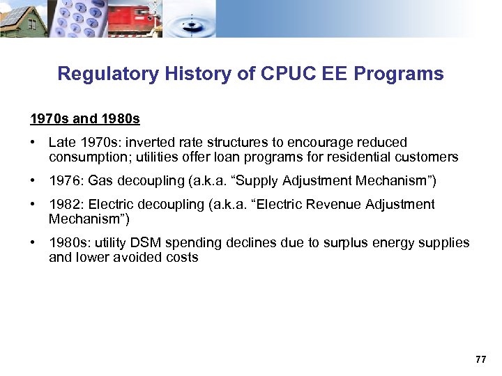 Regulatory History of CPUC EE Programs 1970 s and 1980 s • Late 1970 s: inverted rate structures to encourage reduced consumption; utilities offer loan programs for residential customers • 1976: Gas decoupling (a. k. a. “Supply Adjustment Mechanism”) • 1982: Electric decoupling (a. k. a. “Electric Revenue Adjustment Mechanism”) • 1980 s: utility DSM spending declines due to surplus energy supplies and lower avoided costs 77