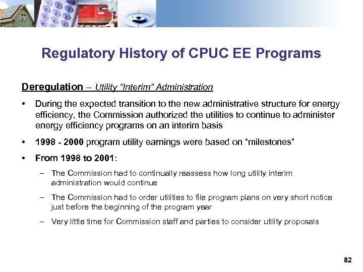 Regulatory History of CPUC EE Programs Deregulation – Market Transformation, Independent Administration, and CBEE • In 1997, with the advent of electric restructuring and a shift towards market-based energy services, the Commission: – Began to shift from energy efficiency resource procurement to market transformation – Announced its intention to move administration of energy efficiency programs from the utility companies to an independent entity through a completive solicitation – Appointed an independent board, the California Board for Energy Efficiency (CBEE), to oversee the transition to independent administration 81