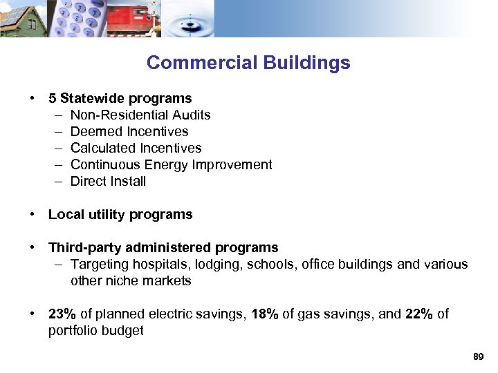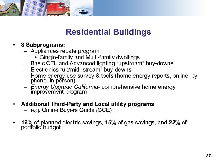 Residential Buildings • 8 Subprograms: – Appliances rebate program • Single-family and Multi-family dwellings – Basic CFL and Advanced lighting “upstream” buy-downs – Electronics “up/mid- stream” buy-downs – Home energy use survey & tools (home energy reports, online, by phone, in person) – Energy Upgrade California- comprehensive home energy improvement program • Additional Third-Party and Local utility programs – e. g. Online Buyers Guide (SCE) • 18% of planned electric savings, 15% of gas savings, and 22% of portfolio budget 87