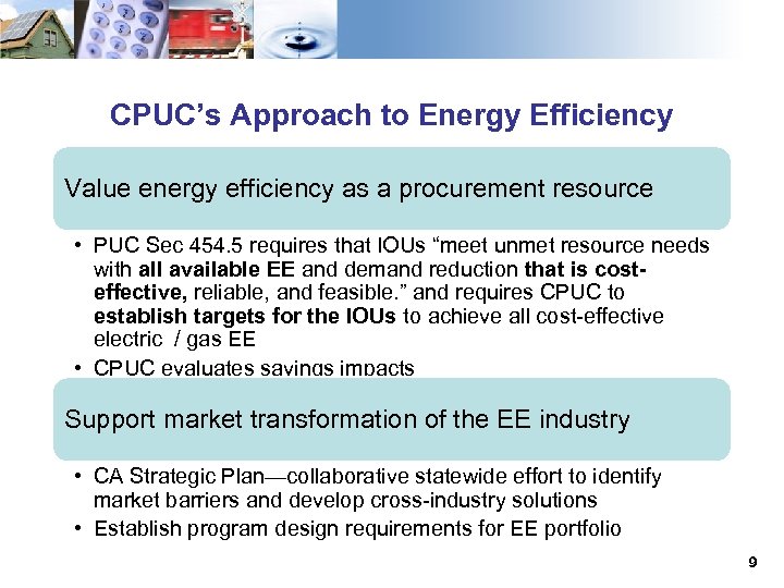 CPUC’s Approach to Energy Efficiency Value energy efficiency as a procurement resource • PUC Sec 454. 5 requires that IOUs “meet unmet resource needs with all available EE and demand reduction that is costeffective, reliable, and feasible. ” and requires CPUC to establish targets for the IOUs to achieve all cost-effective electric / gas EE • CPUC evaluates savings impacts Support market transformation of the EE industry • CA Strategic Plan—collaborative statewide effort to identify market barriers and develop cross-industry solutions • Establish program design requirements for EE portfolio 9
