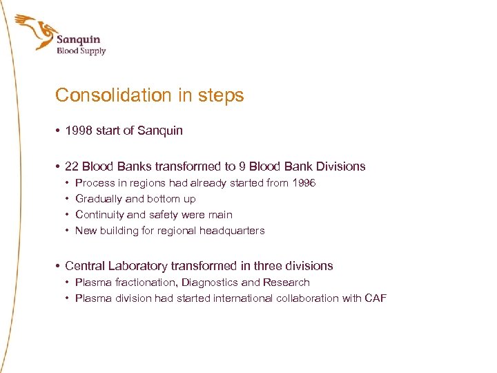 Consolidation in steps • 1998 start of Sanquin • 22 Blood Banks transformed to 9 Blood Bank Divisions • • Process in regions had already started from 1996 Gradually and bottom up Continuity and safety were main New building for regional headquarters • Central Laboratory transformed in three divisions • Plasma fractionation, Diagnostics and Research • Plasma division had started international collaboration with CAF