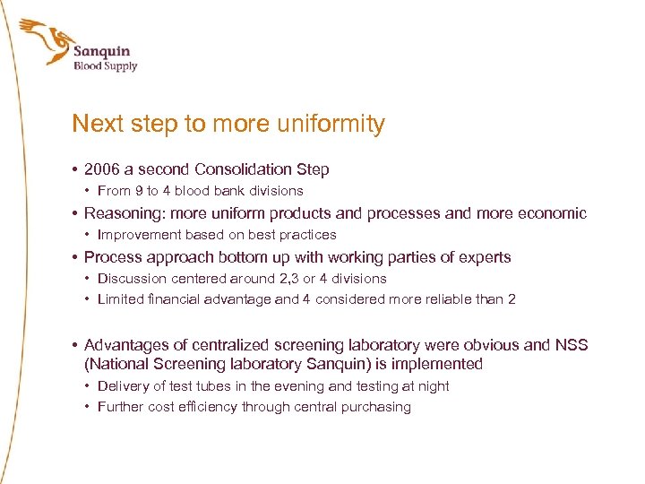 Next step to more uniformity • 2006 a second Consolidation Step • From 9 to 4 blood bank divisions • Reasoning: more uniform products and processes and more economic • Improvement based on best practices • Process approach bottom up with working parties of experts • Discussion centered around 2, 3 or 4 divisions • Limited financial advantage and 4 considered more reliable than 2 • Advantages of centralized screening laboratory were obvious and NSS (National Screening laboratory Sanquin) is implemented • Delivery of test tubes in the evening and testing at night • Further cost efficiency through central purchasing