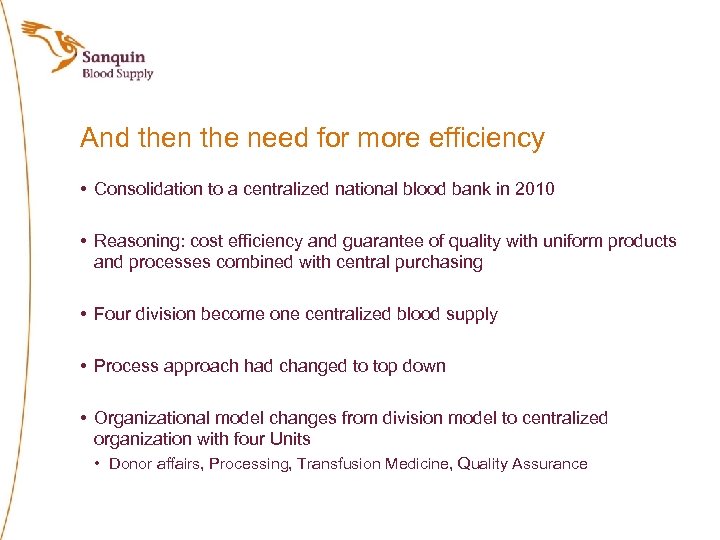 And then the need for more efficiency • Consolidation to a centralized national blood bank in 2010 • Reasoning: cost efficiency and guarantee of quality with uniform products and processes combined with central purchasing • Four division become one centralized blood supply • Process approach had changed to top down • Organizational model changes from division model to centralized organization with four Units • Donor affairs, Processing, Transfusion Medicine, Quality Assurance