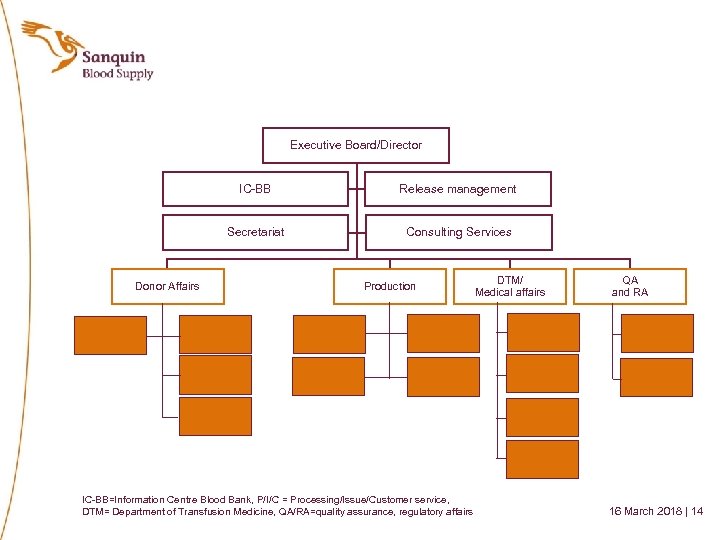 Executive Board/Director IC-BB Secretariat Donor Affairs Release management Consulting Services Production IC-BB=Information Centre Blood Bank, P/I/C = Processing/Issue/Customer service, DTM= Department of Transfusion Medicine, QA/RA=quality assurance, regulatory affairs DTM/ Medical affairs QA and RA 16 March 2018 | 14