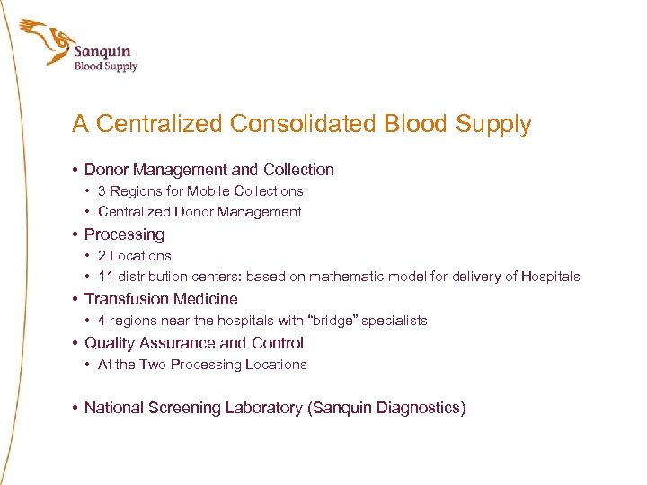 A Centralized Consolidated Blood Supply • Donor Management and Collection • 3 Regions for Mobile Collections • Centralized Donor Management • Processing • 2 Locations • 11 distribution centers: based on mathematic model for delivery of Hospitals • Transfusion Medicine • 4 regions near the hospitals with “bridge” specialists • Quality Assurance and Control • At the Two Processing Locations • National Screening Laboratory (Sanquin Diagnostics)