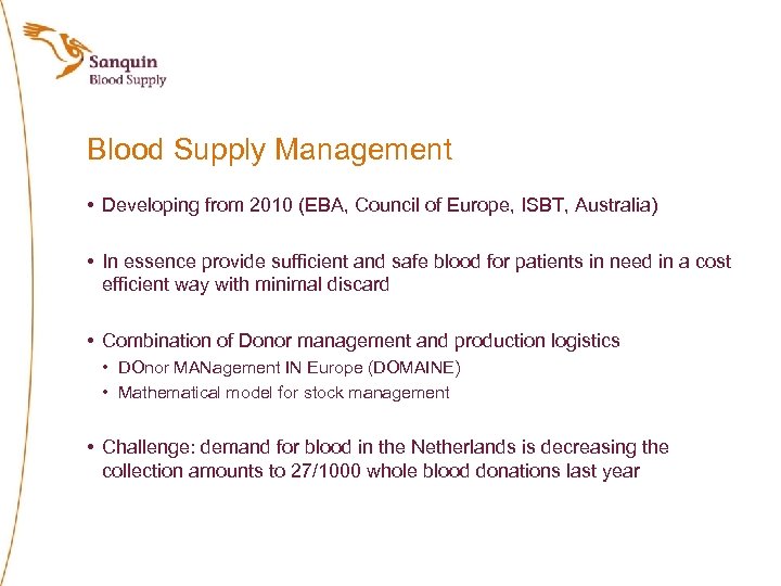 Blood Supply Management • Developing from 2010 (EBA, Council of Europe, ISBT, Australia) • In essence provide sufficient and safe blood for patients in need in a cost efficient way with minimal discard • Combination of Donor management and production logistics • DOnor MANagement IN Europe (DOMAINE) • Mathematical model for stock management • Challenge: demand for blood in the Netherlands is decreasing the collection amounts to 27/1000 whole blood donations last year