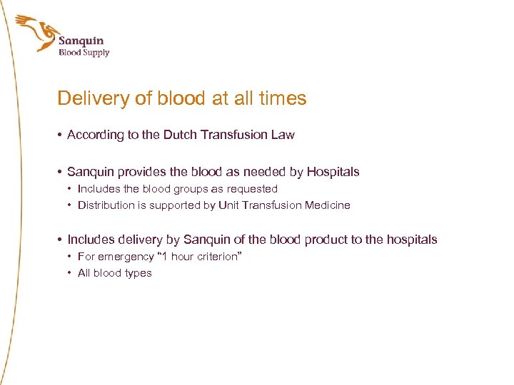 Delivery of blood at all times • According to the Dutch Transfusion Law • Sanquin provides the blood as needed by Hospitals • Includes the blood groups as requested • Distribution is supported by Unit Transfusion Medicine • Includes delivery by Sanquin of the blood product to the hospitals • For emergency “ 1 hour criterion” • All blood types