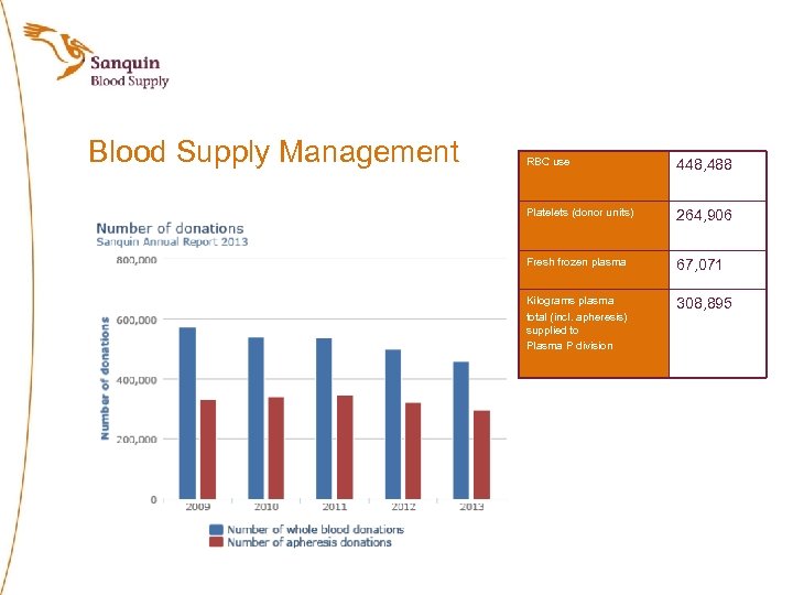 Blood Supply Management RBC use 448, 488 Platelets (donor units) 264, 906 Fresh frozen plasma 67, 071 Kilograms plasma total (incl. apheresis) supplied to Plasma P division 308, 895