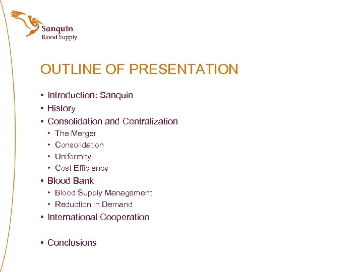 OUTLINE OF PRESENTATION • Introduction: Sanquin • History • Consolidation and Centralization • • The Merger Consolidation Uniformity Cost Efficiency • Blood Bank • Blood Supply Management • Reduction in Demand • International Cooperation • Conclusions