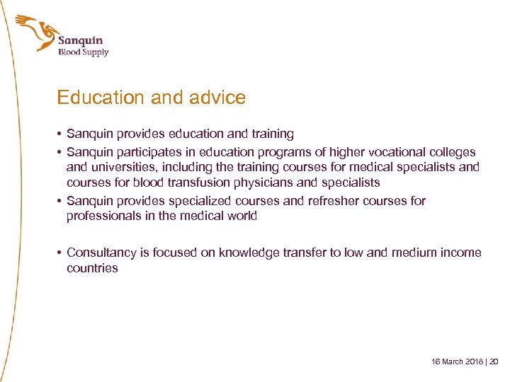 Education and advice • Sanquin provides education and training • Sanquin participates in education programs of higher vocational colleges and universities, including the training courses for medical specialists and courses for blood transfusion physicians and specialists • Sanquin provides specialized courses and refresher courses for professionals in the medical world • Consultancy is focused on knowledge transfer to low and medium income countries 16 March 2018 | 20