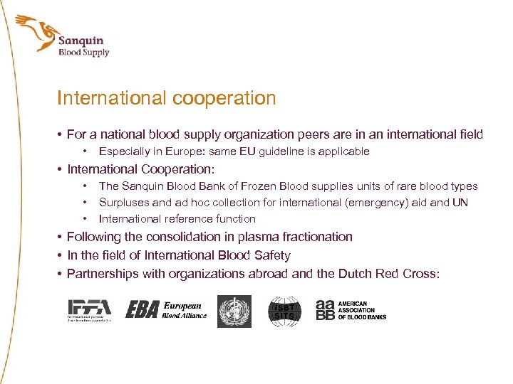 International cooperation • For a national blood supply organization peers are in an international field • Especially in Europe: same EU guideline is applicable • International Cooperation: • • • The Sanquin Blood Bank of Frozen Blood supplies units of rare blood types Surpluses and ad hoc collection for international (emergency) aid and UN International reference function • Following the consolidation in plasma fractionation • In the field of International Blood Safety • Partnerships with organizations abroad and the Dutch Red Cross: