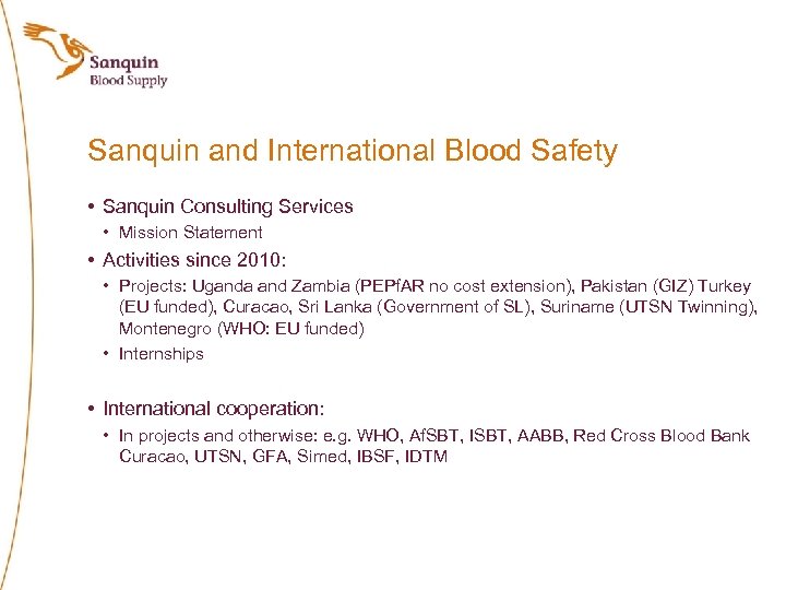Sanquin and International Blood Safety • Sanquin Consulting Services • Mission Statement • Activities since 2010: • Projects: Uganda and Zambia (PEPf. AR no cost extension), Pakistan (GIZ) Turkey (EU funded), Curacao, Sri Lanka (Government of SL), Suriname (UTSN Twinning), Montenegro (WHO: EU funded) • Internships • International cooperation: • In projects and otherwise: e. g. WHO, Af. SBT, ISBT, AABB, Red Cross Blood Bank Curacao, UTSN, GFA, Simed, IBSF, IDTM
