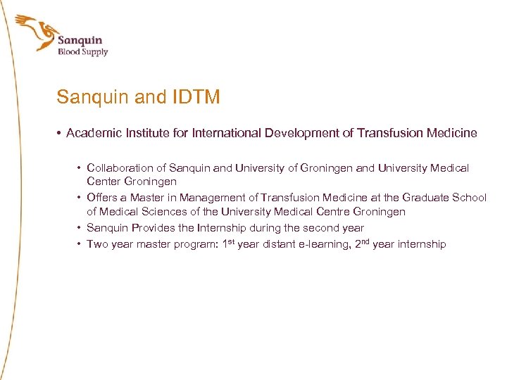 Sanquin and IDTM • Academic Institute for International Development of Transfusion Medicine • Collaboration of Sanquin and University of Groningen and University Medical Center Groningen • Offers a Master in Management of Transfusion Medicine at the Graduate School of Medical Sciences of the University Medical Centre Groningen • Sanquin Provides the Internship during the second year • Two year master program: 1 st year distant e-learning, 2 nd year internship