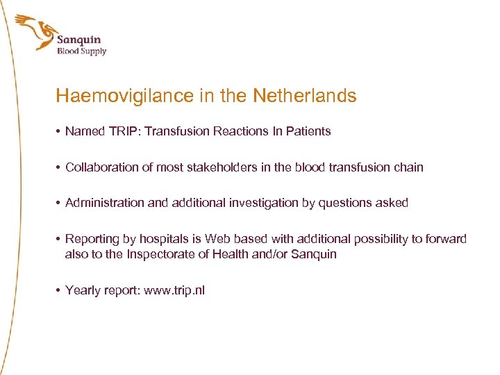 Haemovigilance in the Netherlands • Named TRIP: Transfusion Reactions In Patients • Collaboration of most stakeholders in the blood transfusion chain • Administration and additional investigation by questions asked • Reporting by hospitals is Web based with additional possibility to forward also to the Inspectorate of Health and/or Sanquin • Yearly report: www. trip. nl