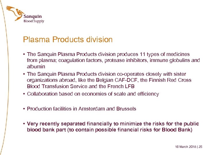 Plasma Products division • The Sanquin Plasma Products division produces 11 types of medicines from plasma; coagulation factors, protease inhibitors, immune globulins and albumin • The Sanquin Plasma Products division co-operates closely with sister organizations abroad, like the Belgian CAF-DCF, the Finnish Red Cross Blood Transfusion Service and the French LFB • Collaboration based on economies of scale and efficiency • Production facilities in Amsterdam and Brussels • Very recently separated financially to minimize the risks for the public blood bank part (to contain possible financial risks for Blood Bank) 16 March 2018 | 25