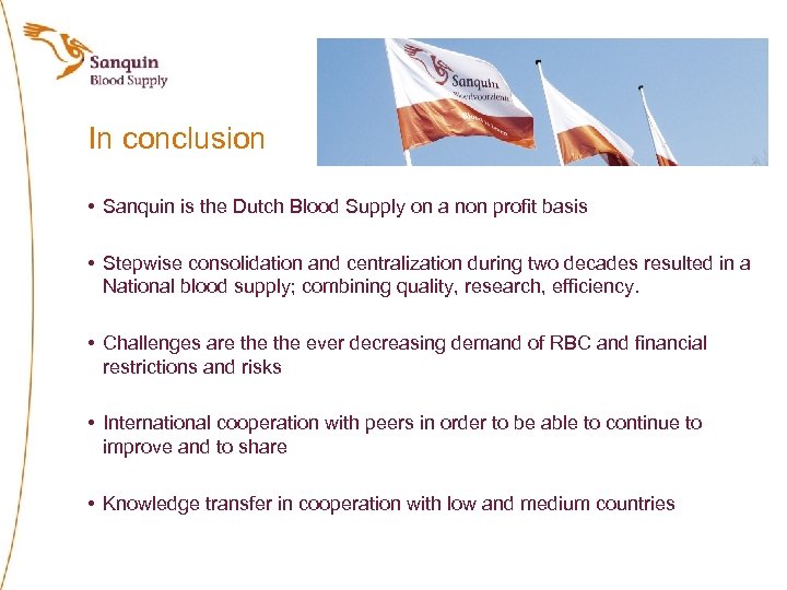 In conclusion • Sanquin is the Dutch Blood Supply on a non profit basis • Stepwise consolidation and centralization during two decades resulted in a National blood supply; combining quality, research, efficiency. • Challenges are the ever decreasing demand of RBC and financial restrictions and risks • International cooperation with peers in order to be able to continue to improve and to share • Knowledge transfer in cooperation with low and medium countries