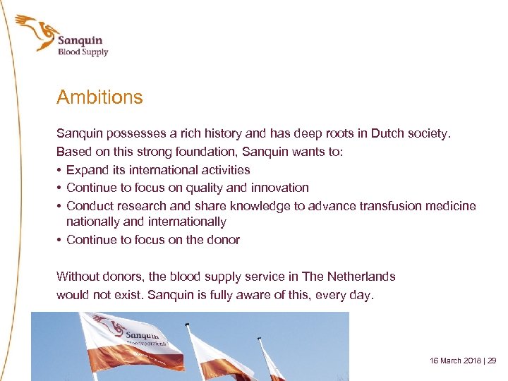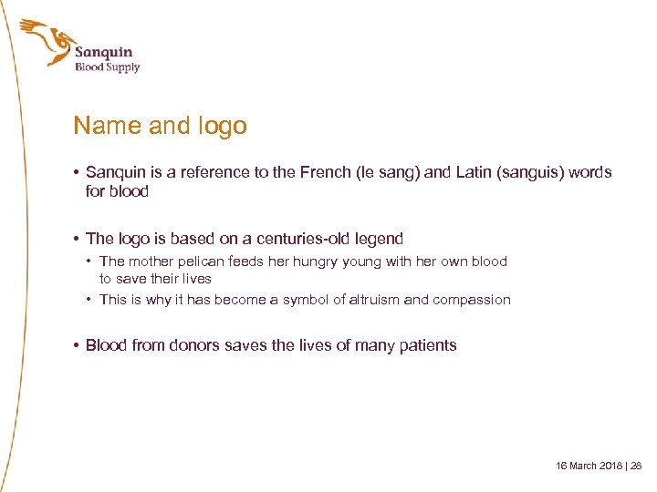 Name and logo • Sanquin is a reference to the French (le sang) and Latin (sanguis) words for blood • The logo is based on a centuries-old legend • The mother pelican feeds her hungry young with her own blood to save their lives • This is why it has become a symbol of altruism and compassion • Blood from donors saves the lives of many patients 16 March 2018 | 28