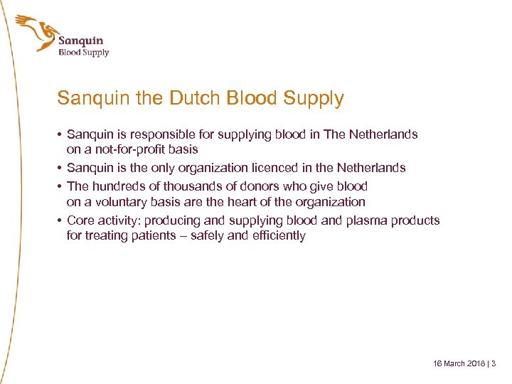 Sanquin the Dutch Blood Supply • Sanquin is responsible for supplying blood in The Netherlands on a not-for-profit basis • Sanquin is the only organization licenced in the Netherlands • The hundreds of thousands of donors who give blood on a voluntary basis are the heart of the organization • Core activity: producing and supplying blood and plasma products for treating patients – safely and efficiently 16 March 2018 | 3