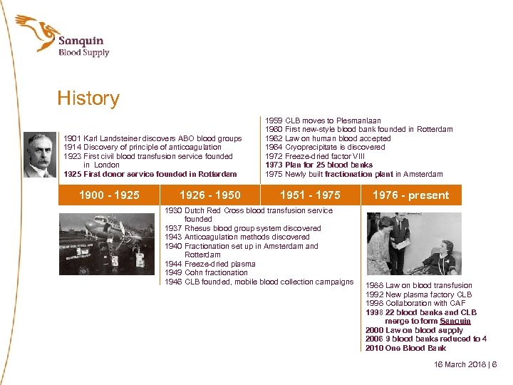 History 1901 Karl Landsteiner discovers ABO blood groups 1914 Discovery of principle of anticoagulation 1923 First civil blood transfusion service founded in London 1925 First donor service founded in Rotterdam 1900 - 1925 1926 - 1950 1959 CLB moves to Plesmanlaan 1960 First new-style blood bank founded in Rotterdam 1962 Law on human blood accepted 1964 Cryoprecipitate is discovered 1972 Freeze-dried factor VIII 1973 Plan for 25 blood banks 1975 Newly built fractionation plant in Amsterdam 1951 - 1975 1930 Dutch Red Cross blood transfusion service founded 1937 Rhesus blood group system discovered 1943 Anticoagulation methods discovered 1940 Fractionation set up in Amsterdam and Rotterdam 1944 Freeze-dried plasma 1949 Cohn fractionation 1946 CLB founded, mobile blood collection campaigns 1976 - present 1988 Law on blood transfusion 1992 New plasma factory CLB 1998 Collaboration with CAF 1998 22 blood banks and CLB merge to form Sanquin 2000 Law on blood supply 2006 9 blood banks reduced to 4 2010 One Blood Bank 16 March 2018 | 6