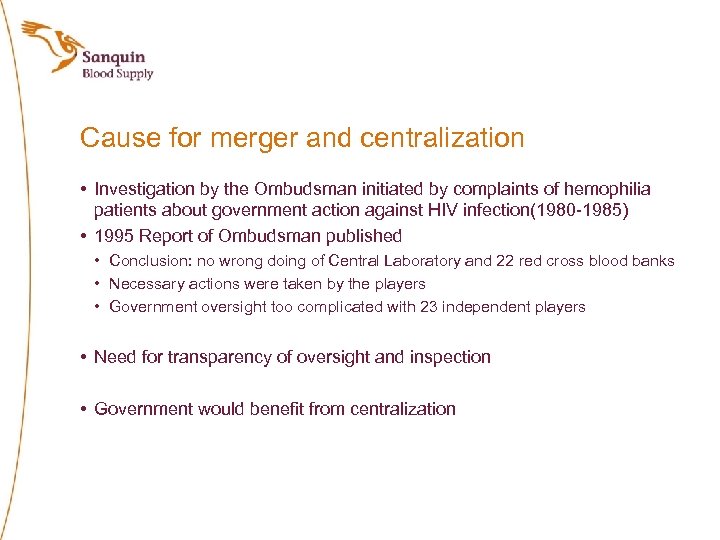 Cause for merger and centralization • Investigation by the Ombudsman initiated by complaints of hemophilia patients about government action against HIV infection(1980 -1985) • 1995 Report of Ombudsman published • Conclusion: no wrong doing of Central Laboratory and 22 red cross blood banks • Necessary actions were taken by the players • Government oversight too complicated with 23 independent players • Need for transparency of oversight and inspection • Government would benefit from centralization