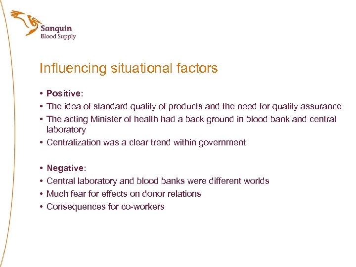Influencing situational factors • Positive: • The idea of standard quality of products and the need for quality assurance • The acting Minister of health had a back ground in blood bank and central laboratory • Centralization was a clear trend within government • • Negative: Central laboratory and blood banks were different worlds Much fear for effects on donor relations Consequences for co-workers