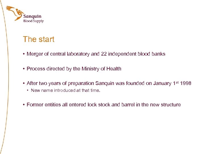 The start • Merger of central laboratory and 22 independent blood banks • Process directed by the Ministry of Health • After two years of preparation Sanquin was founded on January 1 st 1998 • New name introduced at that time. • Former entities all entered lock stock and barrel in the new structure